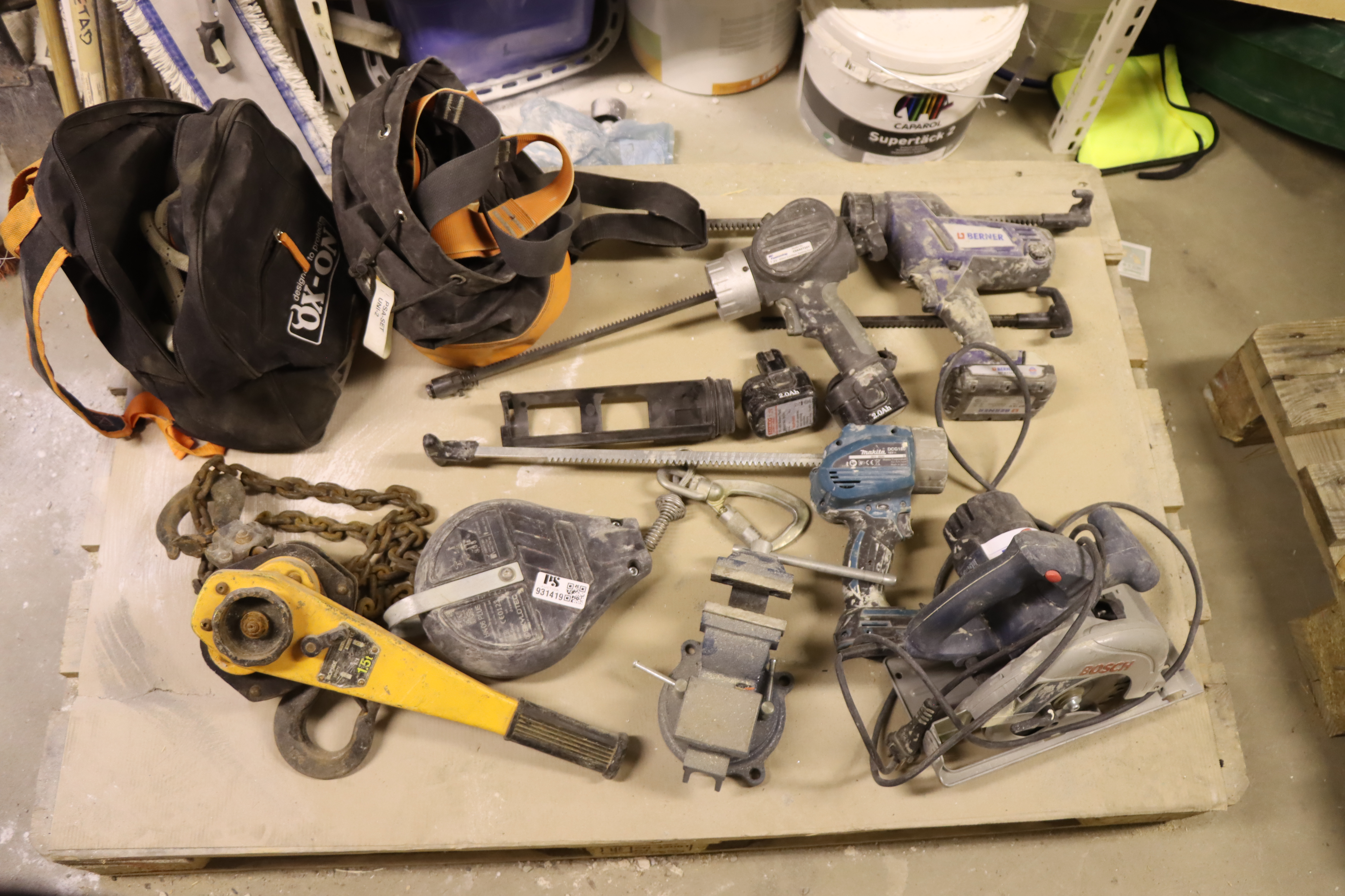 Fallskydd, fallskyddsblock, skruvstäd, cirkelsåg.